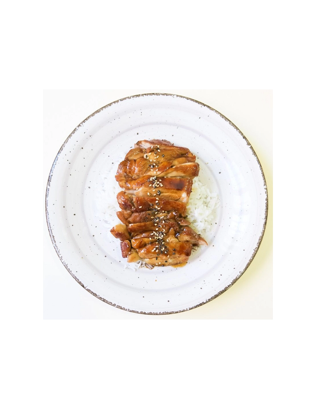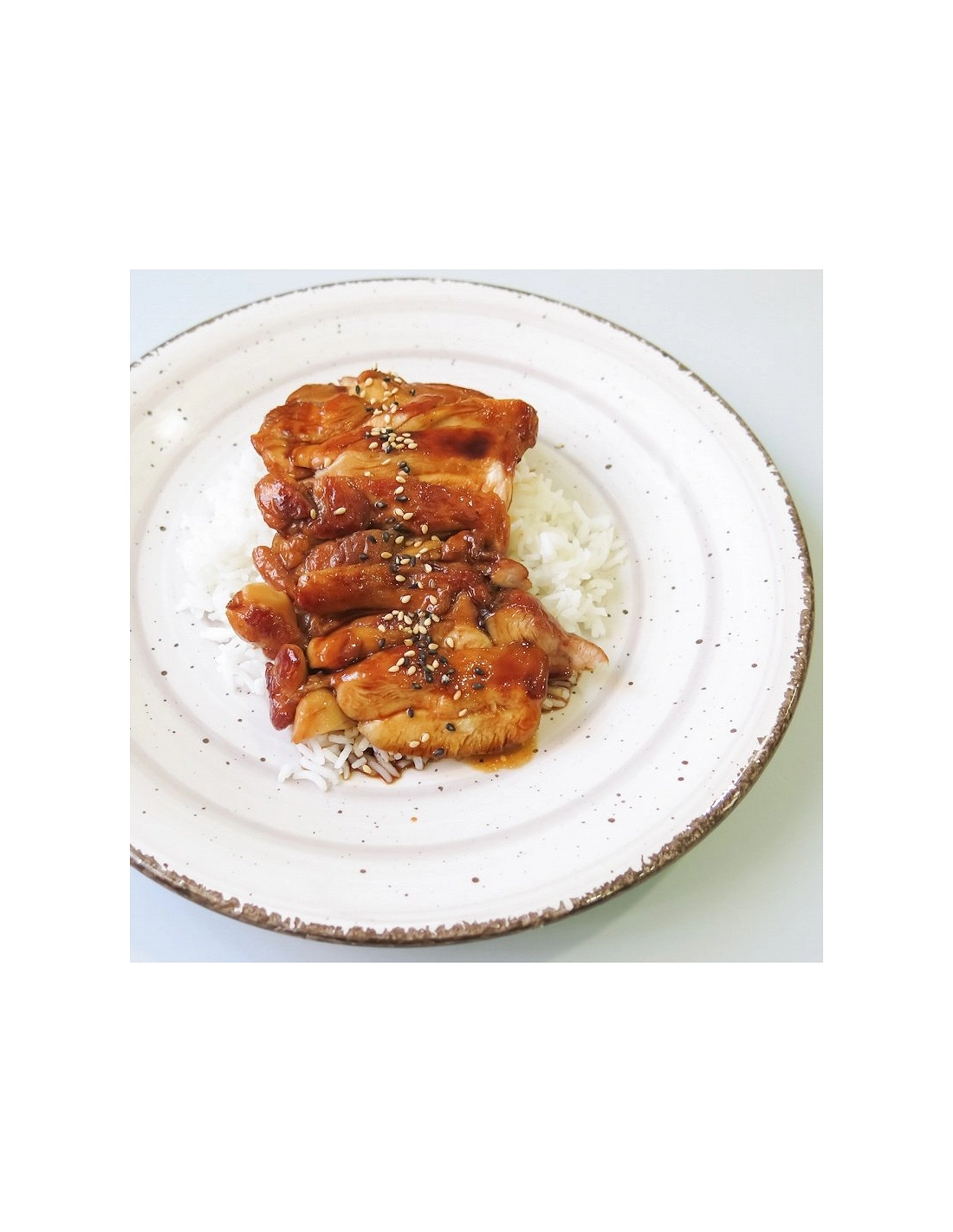 Contramuslos de pollo, arroz, salsa de soja, mirin, sake, azúcar, aceite de oliva suave, sésamo, aceite de sésamoPeso de la ración