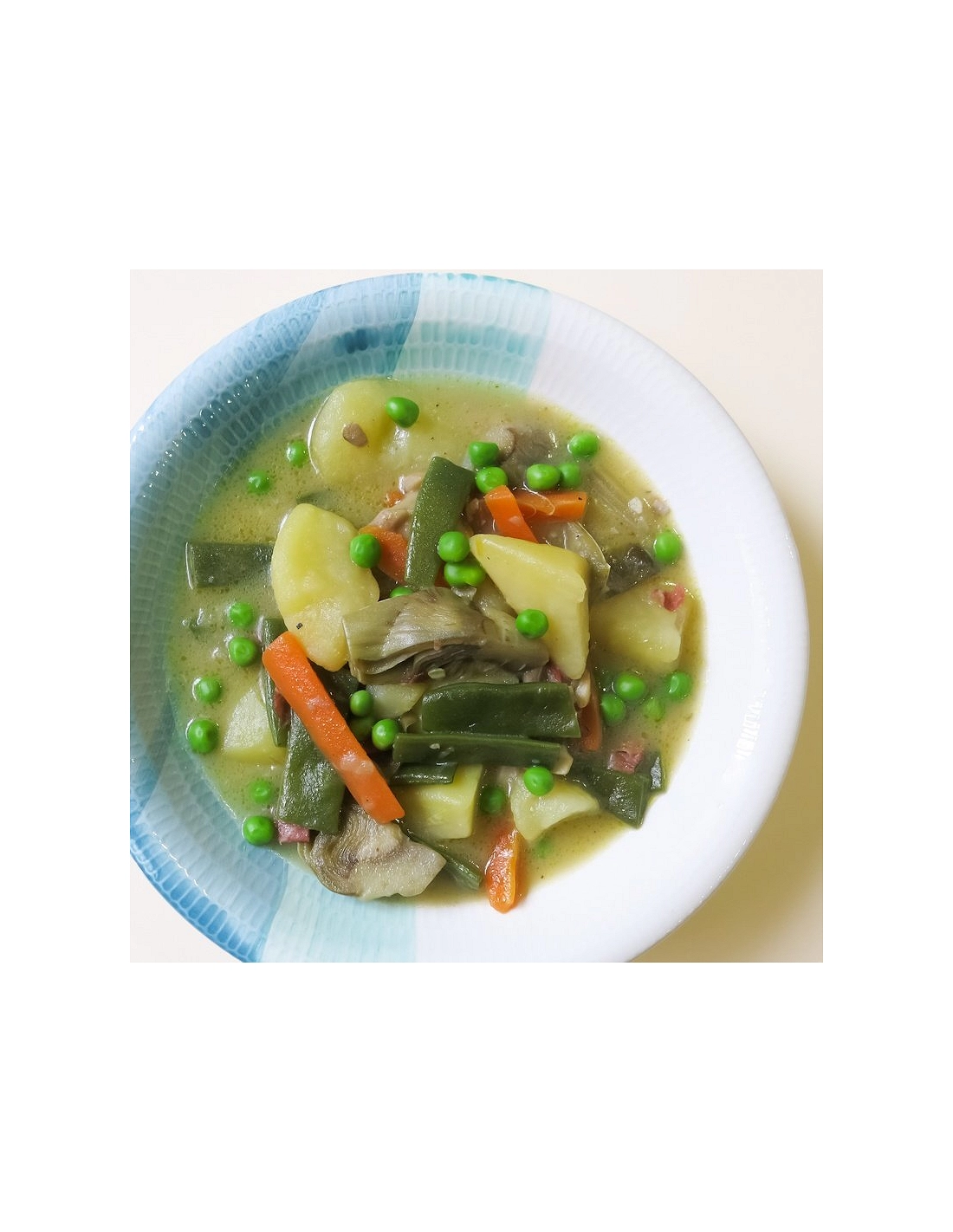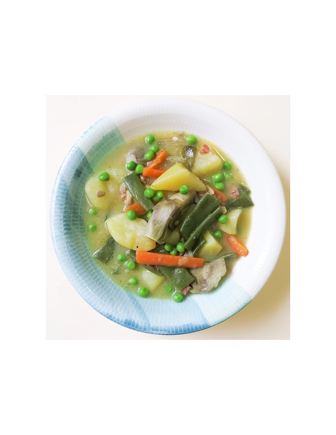 Patatas, judía verde, zanahoria, seta de cardo, cardo, alcachofa, guisantes, jamón serrano, aceite de oliva virgen, harina de trigo, sal, ajoPeso de la ración