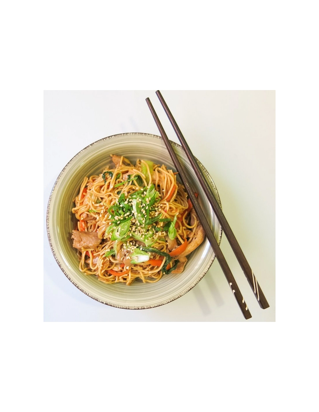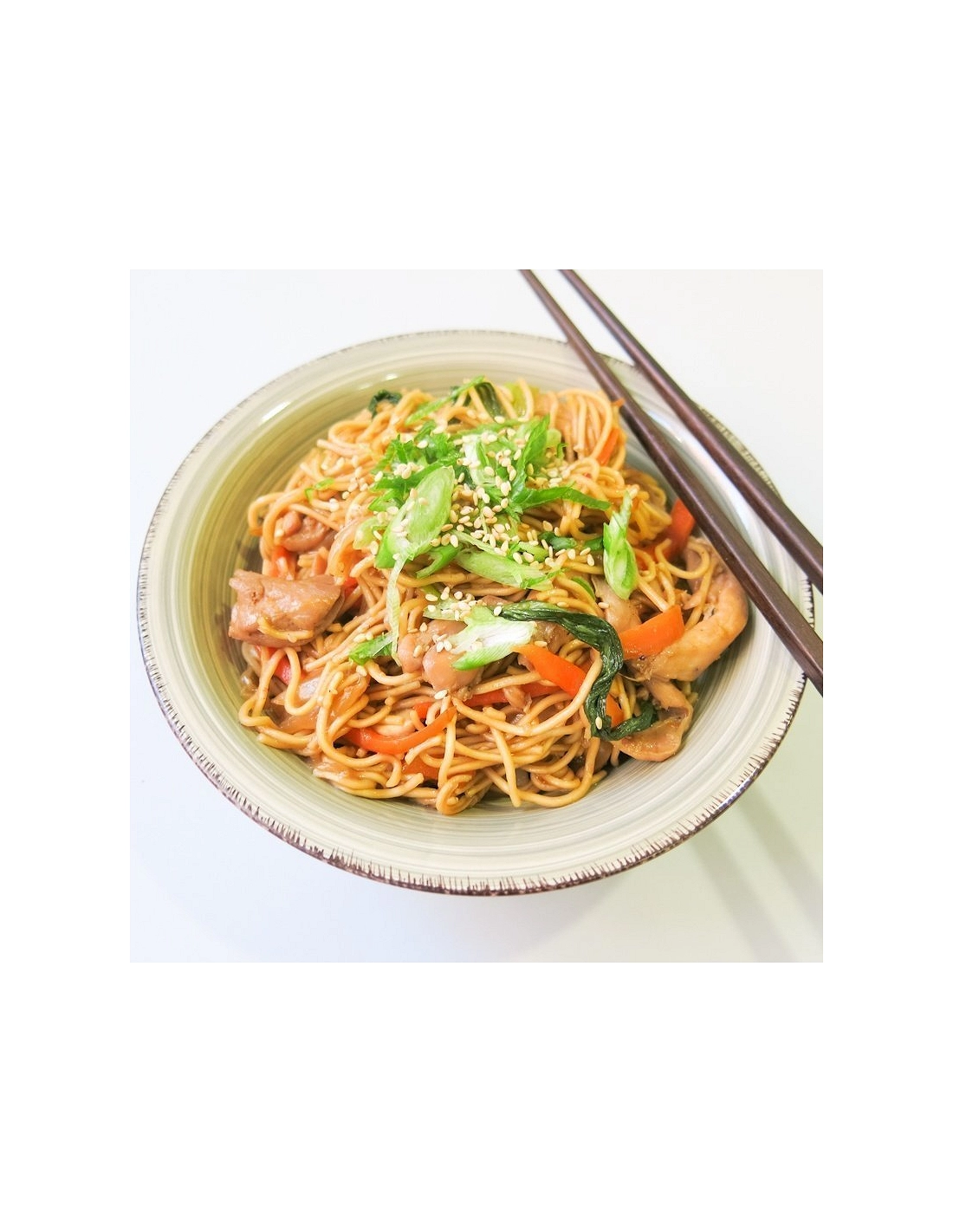 Contramuslos de pollo, noodles de huevo, zanahoria, pak choi, langostinos, champiñón, cebolleta, salsa de soja, aceite de girasol, salsa de ostras, ajo, aceite de sésamo, sésamo blanco, pimienta sichuan, guindilla secaPeso de la ración